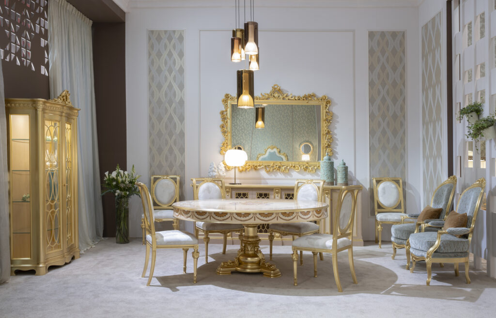 Nel cuore dello stand, la main dining room ruotava attorno al tavolo Brahma, interpretato con madreperla bianca e intarsi decorativi che esaltano l’altissima artigianalità. La composizione è stata completata da sedie in toni avorio con finiture in foglia oro e vetrine coordinate, impreziosite da intarsi in frassino, noce rigato, tanganika e madreperla.
