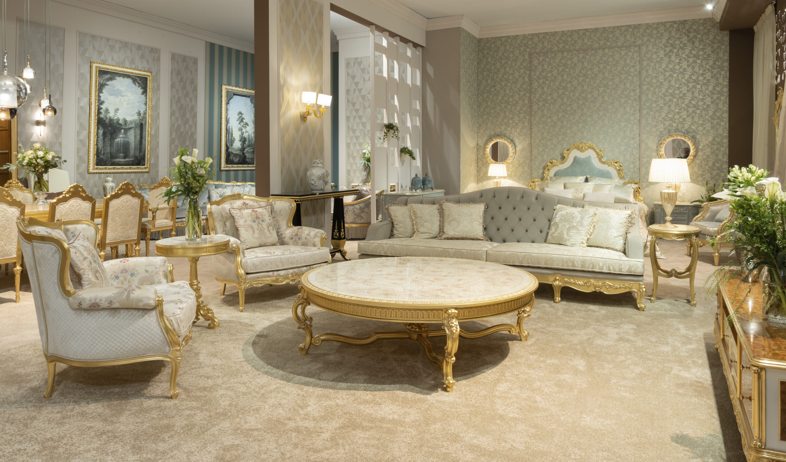 All’ingresso dello stand, la living room Aryaman ha introdotto immediatamente lo spirito della collezione. Al centro, un tavolino con top in madreperla riflette la luce con eleganza, accompagnato da dettagli in oro giallo foglia oro e una base in noce con delicata patina bianca. Hanno completato lo spazio due divani tre posti, poltrone coordinate, la TV cabinet modello Achillea, consolle laccata in marmo nera con decori in foglia oro e piano in marmo e una scenografica specchiera in foglia oro.