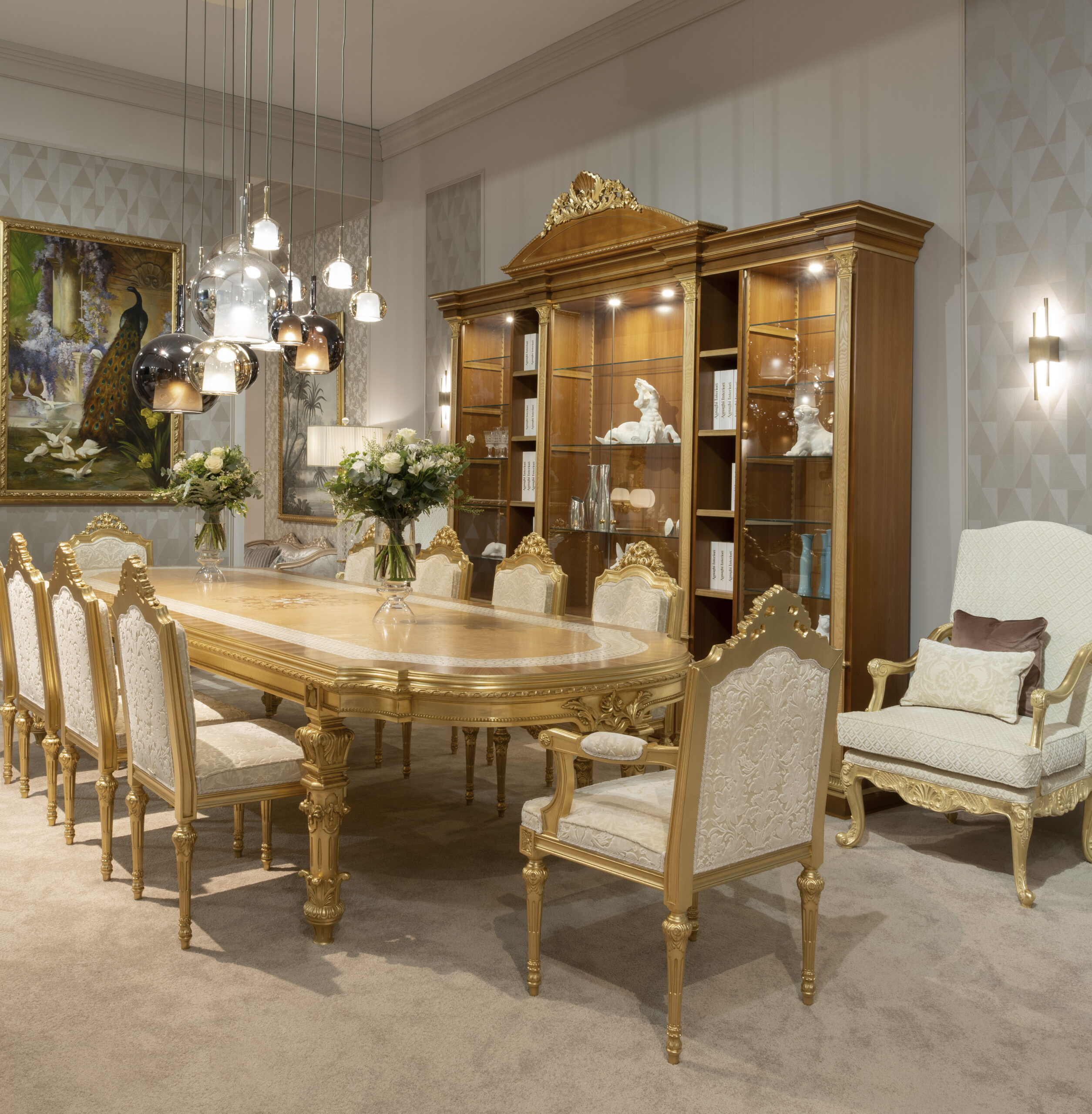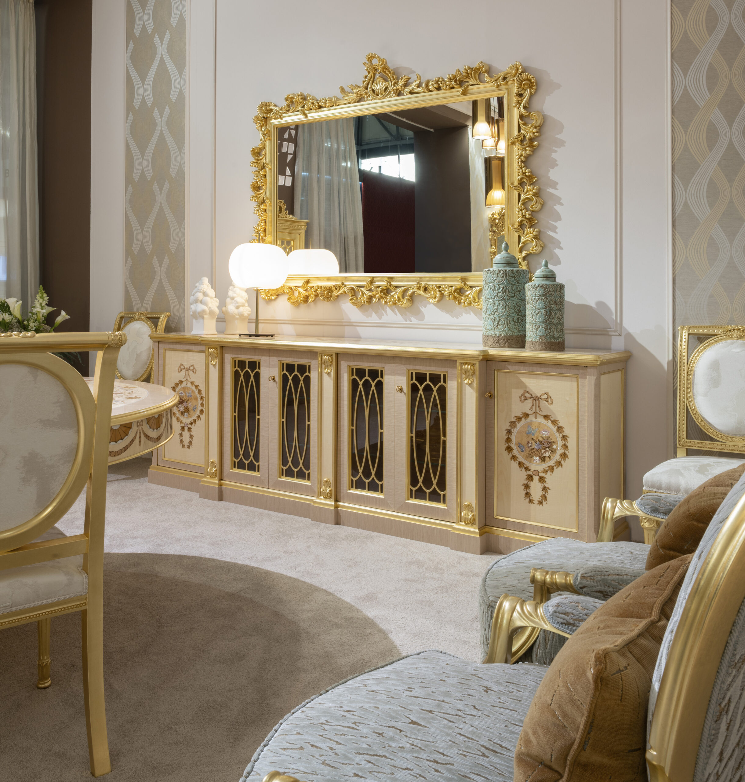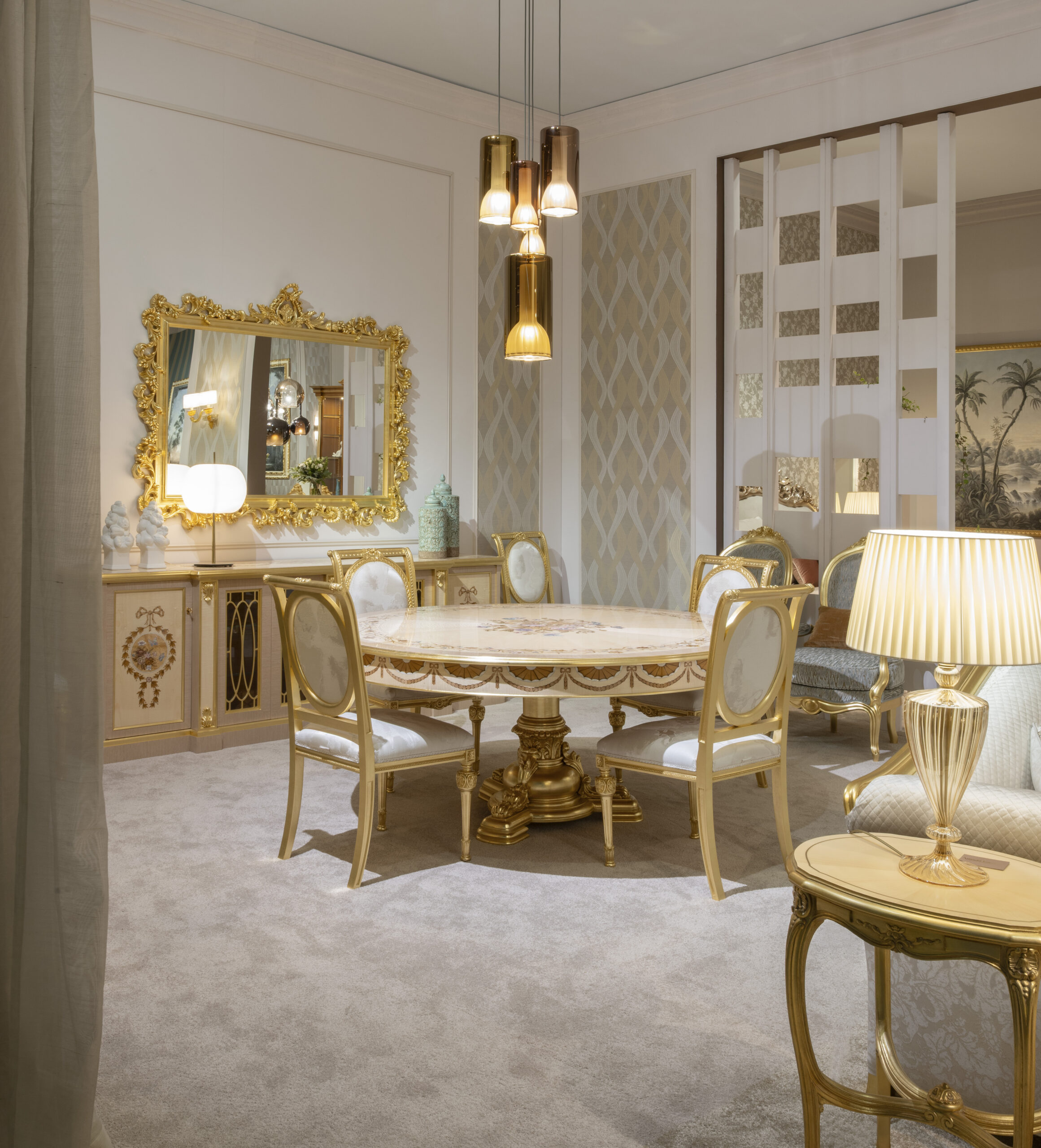 Chiudeva l’esposizione la seconda zona pranzo, in cui il protagonista è stato Inari, un tavolo rotondo in acero e zebrano con intarsi colorati e dettagli in madreperla. Attorno, sedute coordinate e una spettacolare credenza intarsiata con rovere, acero frisè e madreperla. Oro semilucido e patina bianca impreziosivano i complementi – specchiera, vetrina, poltrone – per un effetto complessivo ricercato e coeso.